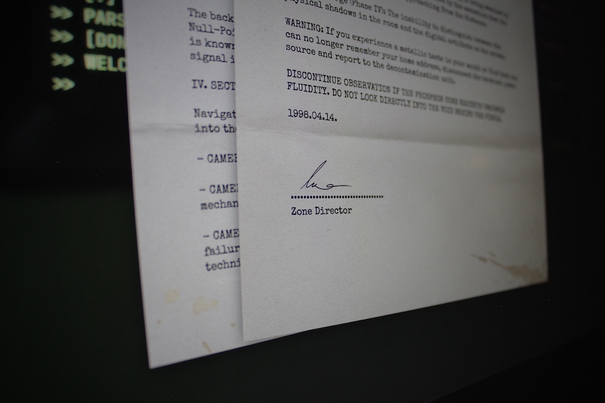 Movement was key to making it feel alive. The buttons depress physically, the screen flickers, and the LED meter tracks the current “radiation” level, which is synced to both visual and auditory noise. Even the manual pages seems to have a physical weight when you flip through them.